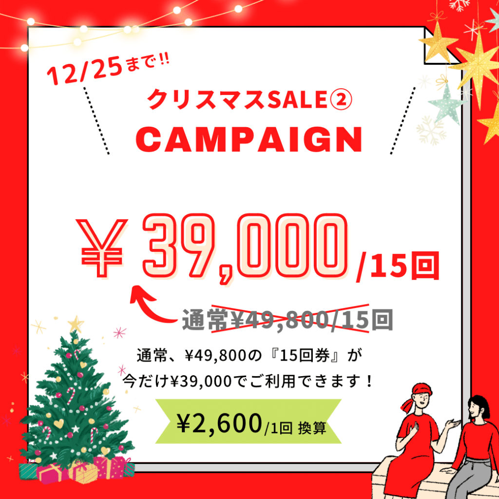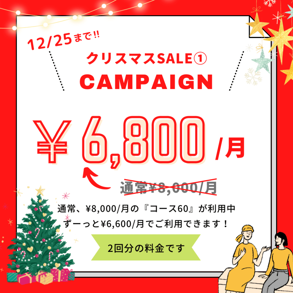 月に2回、合計120分の脱毛施術の「コース60」が12月31日23:59までにご予約いただいたお客様には、通常価格¥8,000/月 のところ、¥6,800/月 でずーっとご利用いただけます ♪