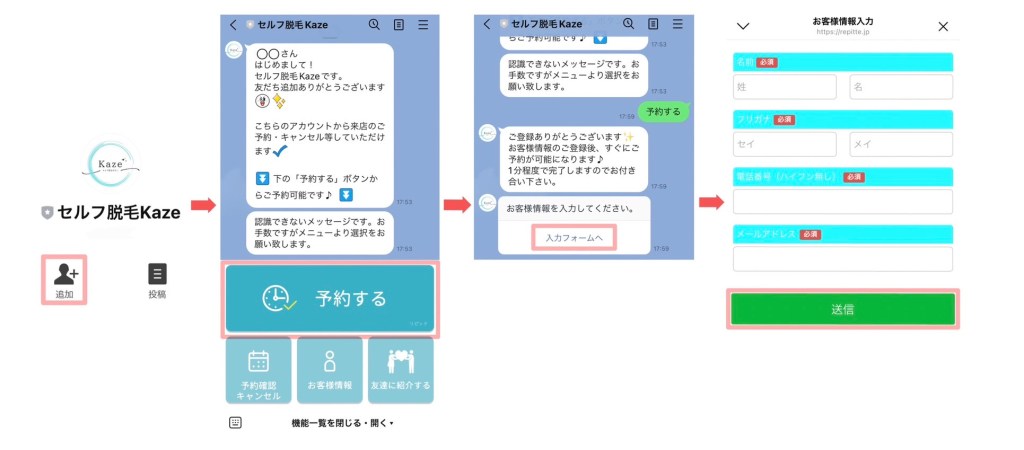 1. セルフ脱毛Kazeの公式LINE(https://lin.ee/w9IzORE)「追加」後、トーク画面「予約する」をタップ。