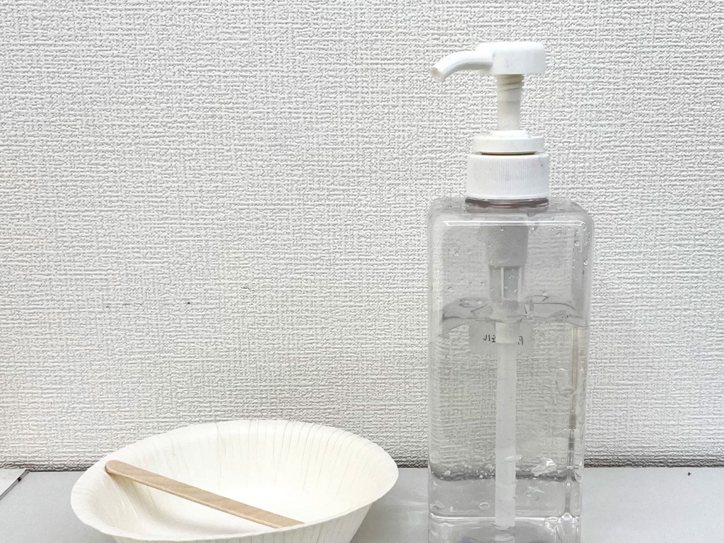 2. 備え付けの消毒液などで脱毛施術箇所を消毒後、専用脱毛ジェルを塗ります。また、傷やホクロ、タトゥー箇所はシールで隠しましょう。